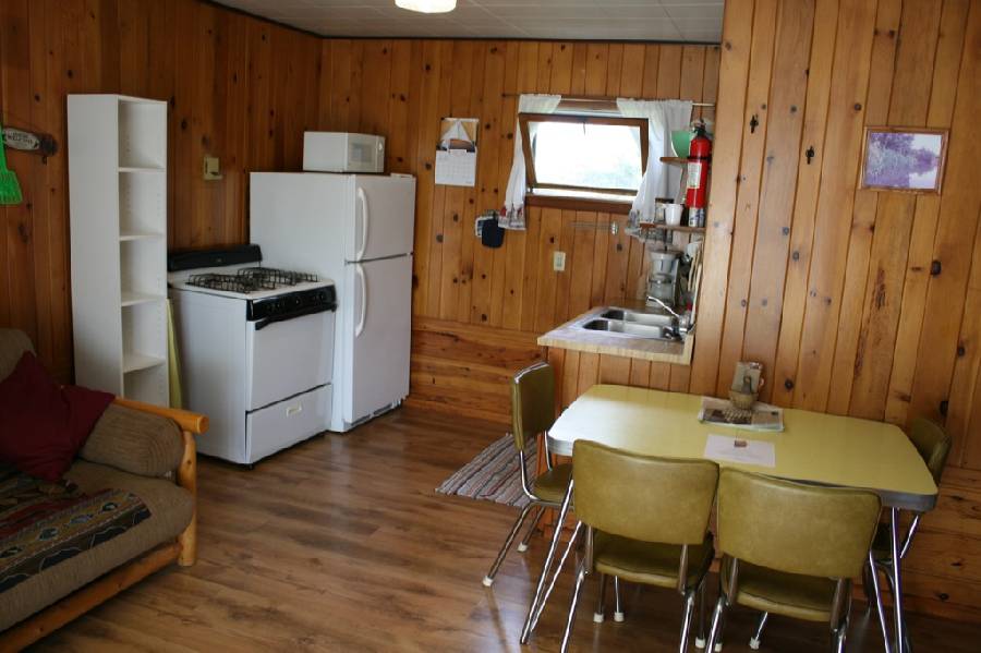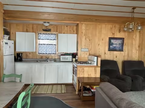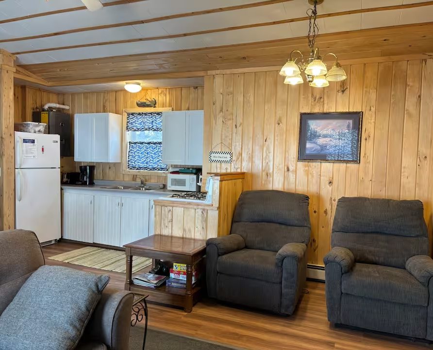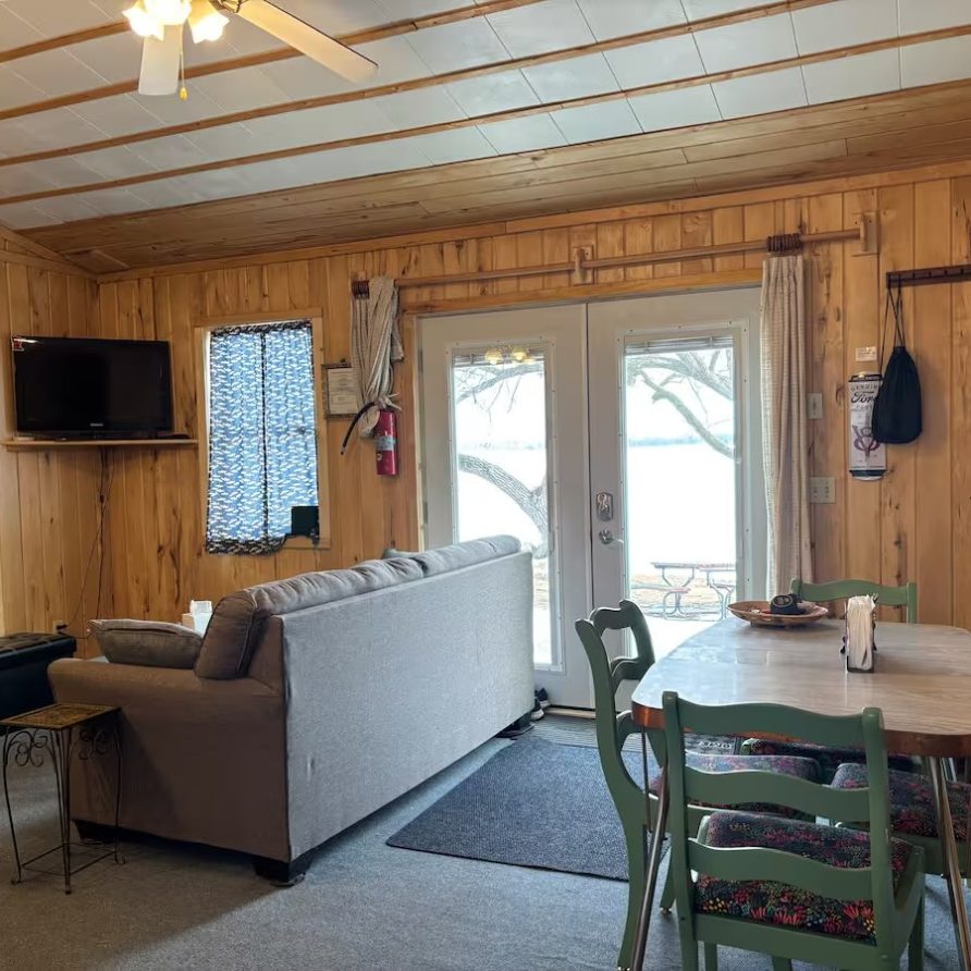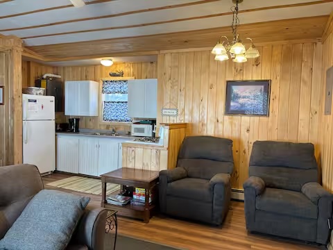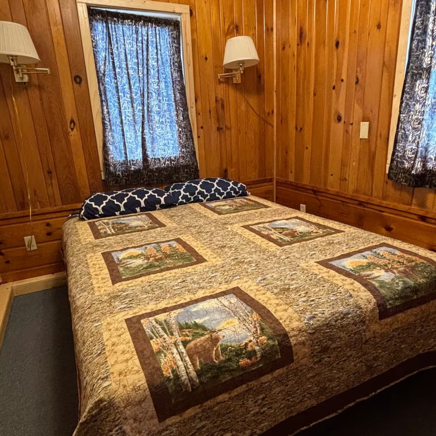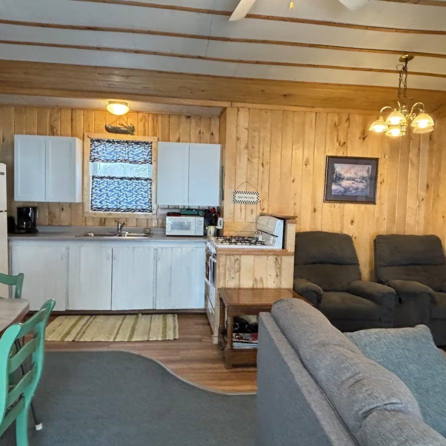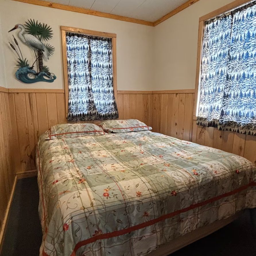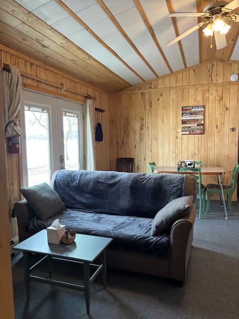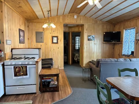 This inviting 2-bedroom cabin features a warm knotty pine interior with carpeted living and sleeping areas for added comfort.