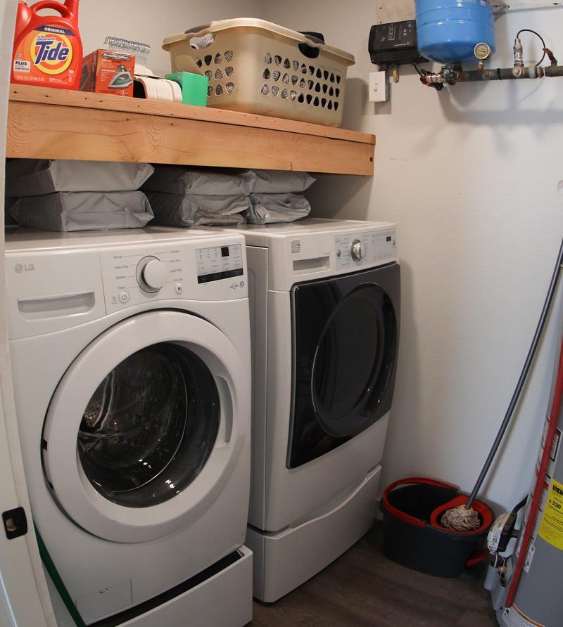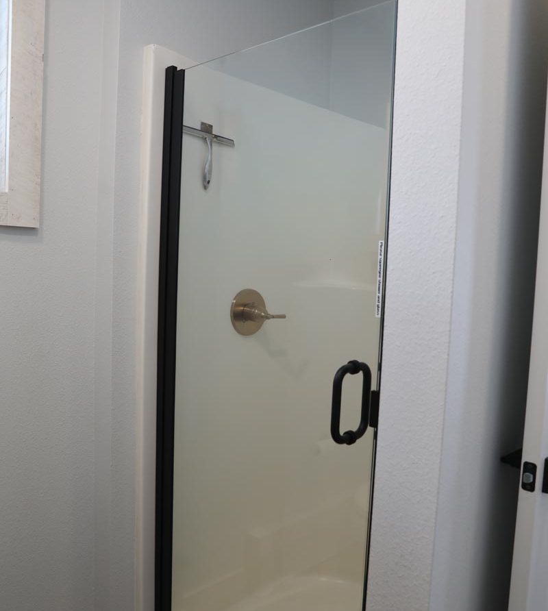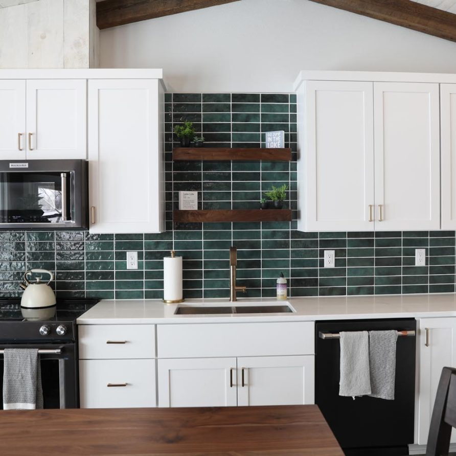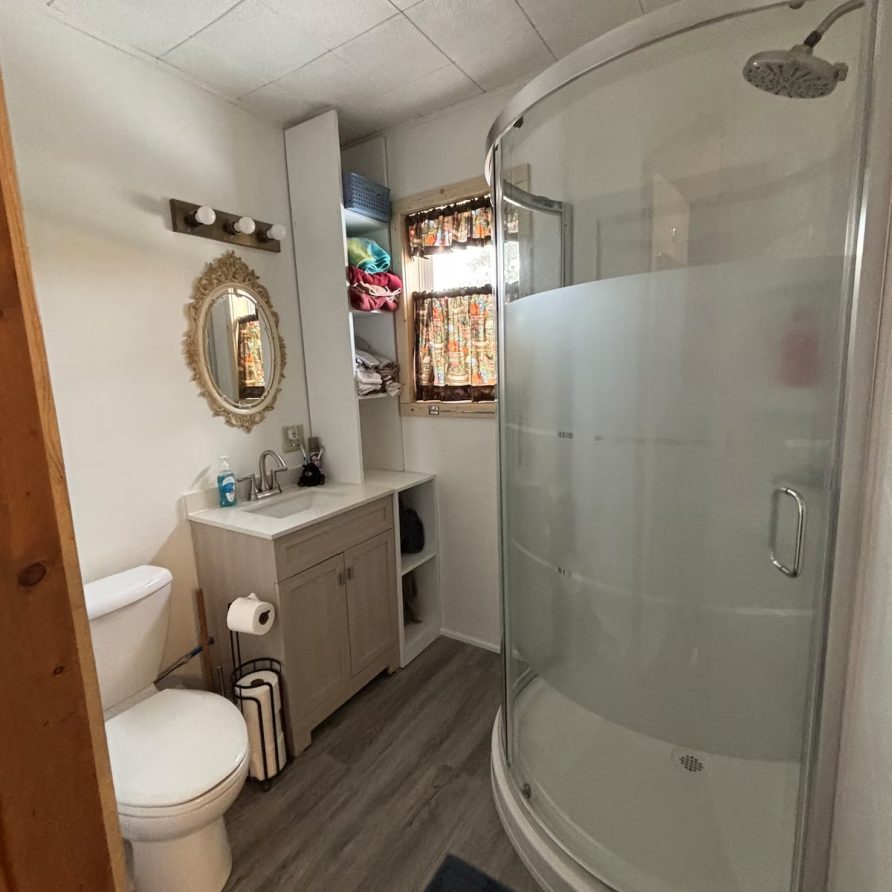 This comfortable 2-bedroom cabin features wood laminate flooring throughout the living room and kitchen, with carpeted bedrooms for added comfort.